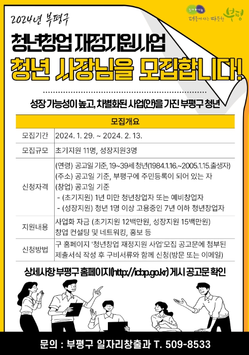 모집 대상은 공고일 기준 부평구에 거주하는 19~39세 청년이다. 초기지원 부문 11명, 성장지원 부문 3명 등 총 14명을 선정할 예정이다.
