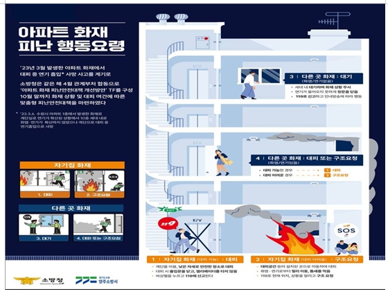 추가로 개선된 피난안전대책의 주요 사항은 불 나면 ‘무조건 대피’보다는 화재 발생 장소와 불길과 연기 등 대피 여건을 판단해 상황에 맞게 ‘살펴서 대피’하는 것이다.