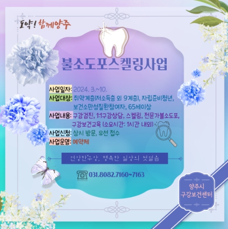 시 관계자는 “올해부터 확대 운영되는 ‘불소 도포 스케일링 사업’에 적극적으로 참여해 꾸준한 구강 건강관리를 하시길 당부드린다”며 “앞으로도 양주시 구강보건센터에서는 양주시민의 구강 건강 증진을 위해 노력할 것”이라고 말했다.