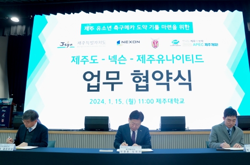 제주도와 넥슨코리아, 제주Utd는 15일 오전 11시 제주대학교 체육관에서 제주 유소년 축구메카 도약과 아세안 국가와의 스포츠 교류 확대를 위한 업무협약(MOU)을 체결했다.