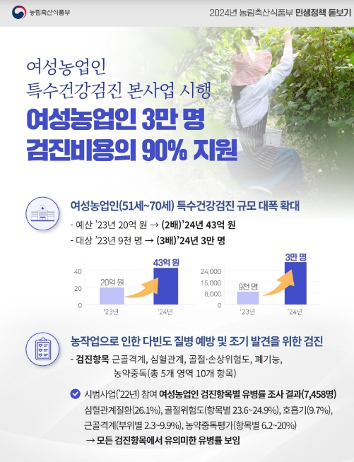 2022년부터 2년간의 시범사업에 이어 올해 본격적으로 시행하는 특수검진사업은 예산과 대상 여성농업인이 전년 대비 각각 2배(20억 → 43억)와 3배(9천명 → 3만명)이상 크게 늘어난 규모로 진행된다.