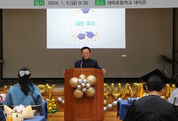 이날 졸업식에는 최연향 대덕초등학교장을 비롯한 전교직원, 재학생, 졸업생(유치원생) 및 학부모님, 제19회 졸업생 정중영총동창회과 임원단 등 50여명이 참석한 가운데 진행됐다.