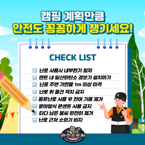 이에 연천소방서는 겨울철 캠핑장 내 화기취급시 안전수칙에 대해 다시 한번 강조했으며, 주요 내용으로는 난로 사용시 내부환기 철저 ▲텐트 내 일산화탄소 경보기 설치하기 ▲난로 주변 가연물 1m 이상 이격 ▲난로 위 물건 적치 금지 ▲등유난로 사용 후 잔여 기름 제거 ▲문어발식 콘센트 사용 금지 ▲타다 남은 불씨 완전히 제거 ▲난로 근처 소화기 비치 등이 있다.