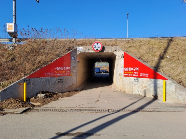 지난 11일부터 12일까지 이틀간 진행된 공사를 통해 통로 입구에 양방향 진입 차단을 위한 지주 파이프를 설치하고, 암거 외벽에는 침수 시 진입 통제를 알리는 경고와 우회 안내판을 부착했다.