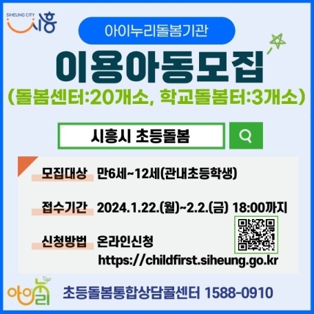 ![]() 시흥시, 2024년 아이누리 돌봄기관 정기 이용 아동 모집 |