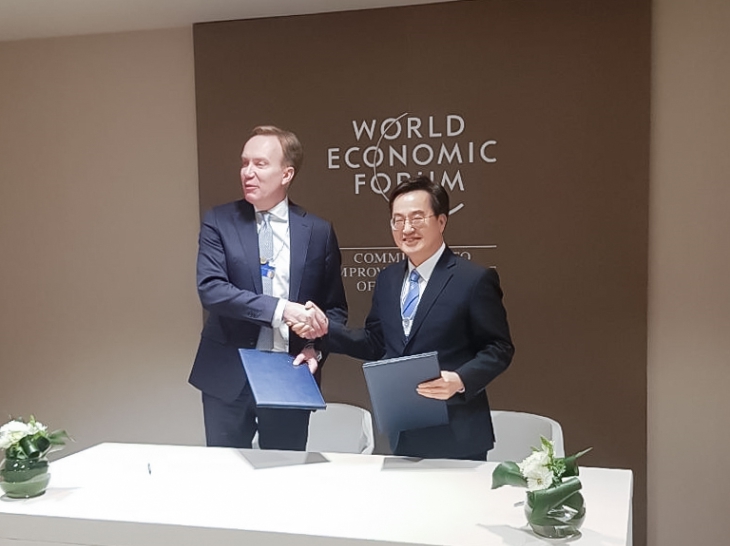 김동연 지사는 현지 시각 15일 오후 3시 스위스 다보스 콩그레스 센터에서 보르게 브렌데(Børge Brende) 세계경제포럼 이사장과 4차산업혁명센터 설립을 위한 업무협약을 체결했다.
