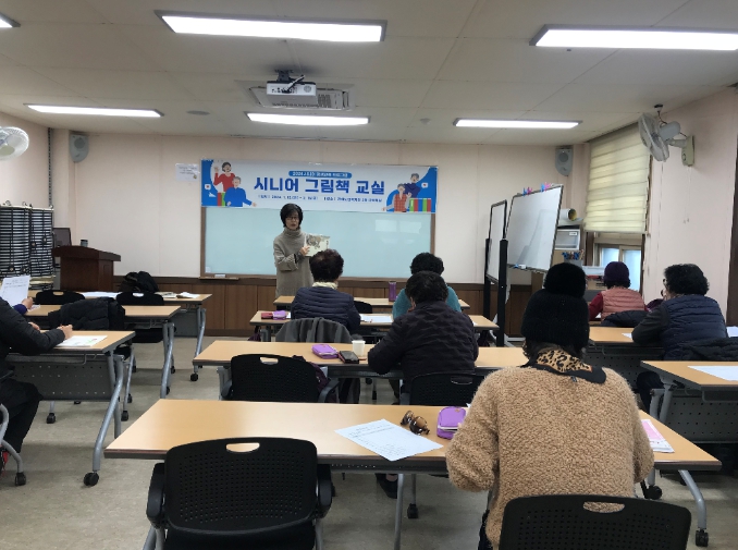 매주 금요일 오전 전하노인복지관에서 운영되는 ‘시니어 그림책 교실’에서는 노인들이 그림책, 동시집과 같은 짧은 글을 읽고 글쓰기, 낭송, 토론, 그림그리기 활동 등 다양한 독후활동을 한다.