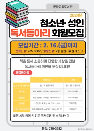 ![]() 강원도 문막교육도서관 청소년‧성인 독서동아리 회원 모집 |