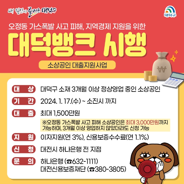 대덕구에 따르면 ‘대덕뱅크’ 지원 대상은 대덕구에 사업장을 두고 3개월 이상 정상영업 중인 소상공인 300여 명을 대상으로 한다.