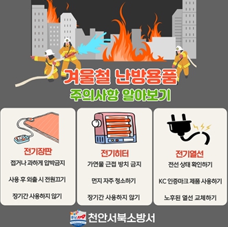 이에 천안서북소방서는 3대 난방용품의 안전한 사용법으로 ▲ KC 인증 마크 제품 사용 ▲ 전선 피복의 벗겨짐 등 여부 확인 ▲ 제품 위에 이불 등을 겹겹이 사용하지 않기 ▲ 외출 및 장기간 미사용 시 전원 끄기 ▲ 근처 인화성 물질 두지 않기 등을 강조했다.