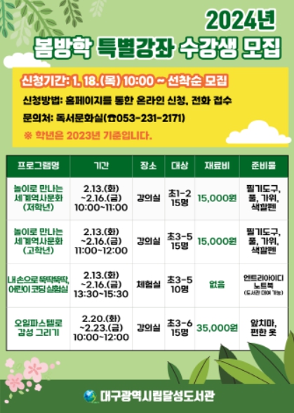 정현호 대구달성도서관 관장은 “봄방학을 맞이하여 우리 학생들이 도서관에서 책과 함께하는 다양한 프로그램을 통해 알찬 방학을 보내고, 다가오는 새 학기도 잘 준비해 나가기를 바란다.”고 말했다.