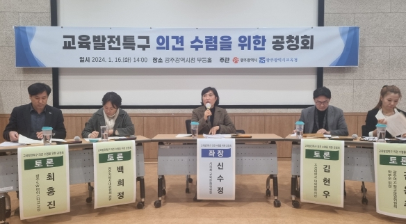 먼저 교육부 김영현 사무관의 ‘교육발전특구 추진 배경 및 방향’의 주제로 발제가 이뤄졌다. 이어 광주시의회 신수정 교육문화위원장을 좌장으로 지정토론자로는 백희정 광주지방시대위원회 위원, 김현우 조선대학교 대외협력처장, 최홍진 광주소프트웨어마이스터고 교장, 김은주 학부모가 참여한 지정 토론이 1시간 동안 진행됐다. 마지막으로 질의응답이 실시돼 교육발전특구에 대한 여러 시민의 목소리를 들을 수 있었다.