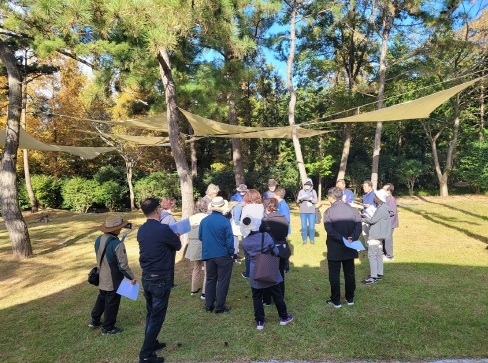 ![]() 지난 2023년 11월, 정원해설사 양성교육 교육생들이 분재정원에서 현장학습(정원 놀이와 교구 활용 수업)에 참여하고 있다. |