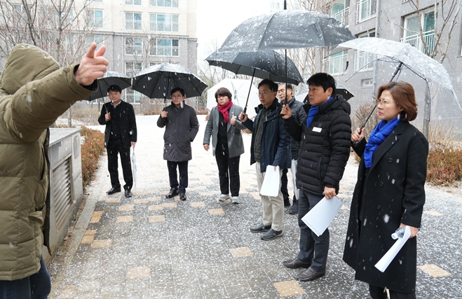 의원들은 이날 위례롯데캐슬아파트 입주자대표회의 이호걸 회장으로부터 단지 내 배수불량으로 인한 피해 현황과 하자보수 상황을 공유하고 아파트 단지를 꼼꼼히 둘러봤다.