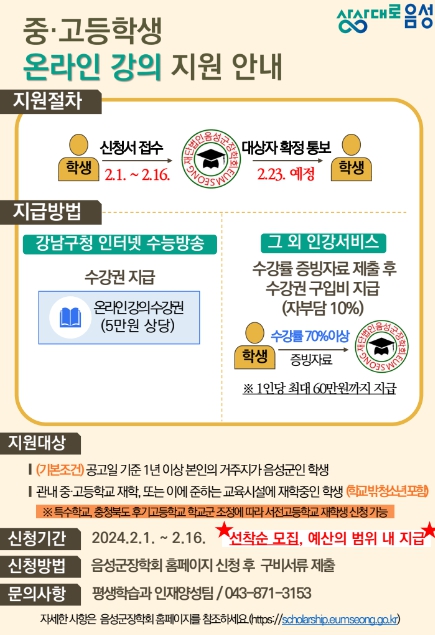 신청 기간은 다음달 1일부터 16일까지 16일간이며, 학생 본인이 음성군장학회 홈페이지에 가입해 신청해야 한다.