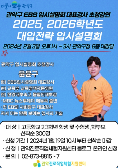 특히 윤윤구 선생님은 교육부의 교육정책 자문 위원으로도 활동하고 있는 만큼 이번 강의를 통해 관악구 학생과 학부모님의 성공적인 대입 전략 수립을 든든히 지원할 예정이다.