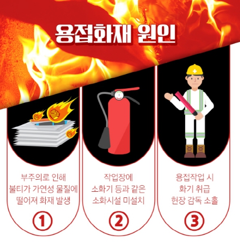 공사장 특성상 주변에 가연성 자재들이 많아 용접·용단 작업 시 화재 위험성이 높으며 소방시설 등의 안전시설이 완전히 설치되어 있지 않아 소화 및 대피가 어려운 만큼 용접·용단 작업에 각별한 주의가 필요하다.