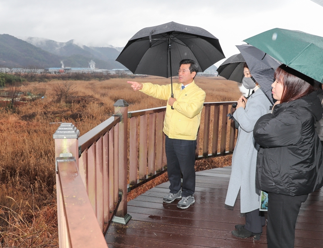 정 시장은 광양읍 합강 도시생태축 복원사업 현장에서 사업계획을 보고받고 현장을 점검했다. 본 사업은 동천과 서천, 억만천과 인덕천이 만나는 합강 일대에 훼손·단절된 습지 생물 서식처 복원, 생태탐방로와 생태체험 공간 등을 조성하는 사업이다.