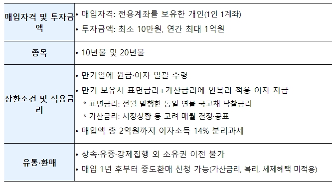 정부는 ’24년에 총 1조원의 개인투자용 국채를 발행할 계획이다. 발행이 개시되면 매월 발표되는 월간 개인투자용 국채 발행계획을 통해 해당 월의 발행액·금리·청약일정 등을 공지할 예정이다. 구입을 희망하는 개인투자자는 판매대행기관에 방문하거나 온라인을 통해 전용계좌를 개설한 후 청약할 수 있다. 10년물·20년물 중 선택하여 최소 10만원부터 연간 1억원까지 구매가 가능하다. 만기까지 보유할 경우 표면금리와 가산금리에 연복리를 적용한 이자가 만기일에 일괄 지급되고, 이자소득 분리과세(14%, 매입액 기준 총 2억원 한도)가 적용된다. 매입 1년 후부터는 중도환매 신청도 가능하다.