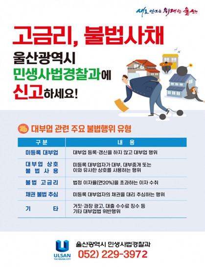 울산시 관계자는 “불법 사채를 사용해 어려움을 겪고 있다면 울산시 민생사법경찰과로 전화하여 법률상담, 무료 변호인 선임 등 도움을 받을 것을 적극 권한다.”라며 “시민들의 어려운 사정을 악용하는 불법 사채 예방을 위해 시민들의 많은 제보를 당부드린다.”라고 말했다.