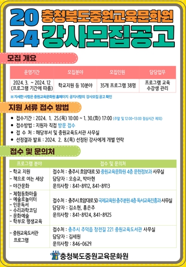 ![]() 충북교육청 중원교육문화원, 2024년 인문독서·문화예술 프로그램 강사 공개 모집 |