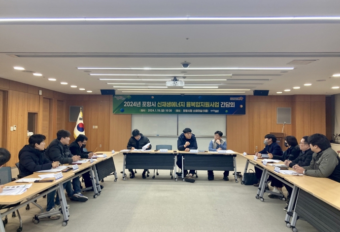 ![]() 19일 포항시청 소회의실에서 신재생에너지 융복합지원사업 간담회를 개최하고 있다. |