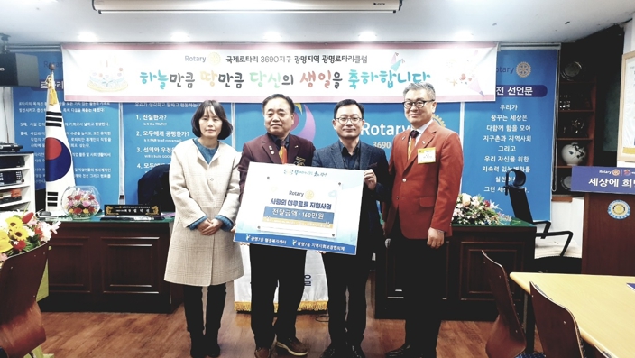 ![]() 국제로타리3690지구 광명로타리클럽은 지난 19일 광명시 광명7동 ‘사랑의 야쿠르트 지원 사업’ 추진을 위한 후원금 160만 원을 동 지역사회보장협의체에 전달했다 |