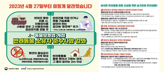 안재완 동물방역과장은 “동물보호법 강화와 더불어 높아진 사회적 눈높이에 맞게 소유자 준수사항과 생활 속 반려동물 공공예절을 준수하여 사람과 동물이 함께 행복한 강원특별자치도 만들기에 도민께서 적극 동참해 주시기를 바란다”고 당부했다.