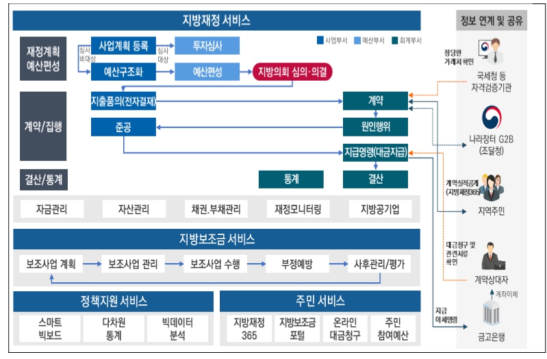 지방재정을 운용하는 ‘e호조+’는 국가재정(e나라도움), 교육재정(K-에듀파인), 사회복지시스템(행복e음), 전 지자체 금고 등과 연계하여 예산집행, 계약 및 자금·자산·부채·세입세출외현금 관리 등의 기능을 제공한다.