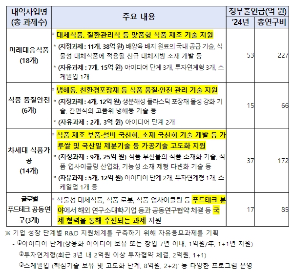 ’24년 총 122억원 규모의 예산이 지원되는 식품 분야 신규 연구개발 과제는 최근의 식품기술 동향과 전문가 및 기업의 수요조사 결과를 바탕으로 선정된 ‘지정공모과제’(24개, 총 75억 원)와 창업 초기부터 규모확대 단계(스케일업)까지 기업 성장단계별 다양한 기업이 참여할 수 있는 ‘자유공모과제’(17개, 총 47억 원)로 구성되며, 선정된 연구과제에 대해서는 최대 4년간 총 550억원 규모의 예산이 투입될 예정이다.
