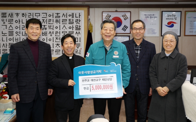 군에 따르면, 태안성당 곽승룡 비오 주임신부와 강 베로니카 수녀, 장경후 사목회장, 가재서 사회복지분과장 등은 19일 군청 군수실에서 가세로 군수가 참석한 가운데 기탁식을 갖고 성금 500만 원을 군에 기탁했다.