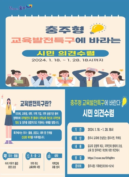 특구 지정과 교육 분야에 관심이 있는 학부모, 학생을 비롯한 시민 누구나 시청 홈페이지와 충주톡을 통해 온라인 설문 참여가 가능하며, 자유롭게 의견을 개진할 수 있다.