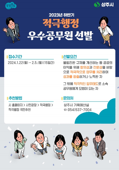 ![]() 상주시, 2023년 하반기 적극행정 우수공무원(팀) 선발 |