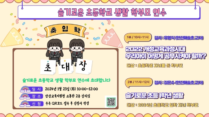 이어서 23일 2부 연수에서는 김은수 교사(안산해솔초)를 강사로 하여‘슬기로운 초등 1학년 생활’이라는 주제로 초등학교 1학년 예비 학부모를 대상으로 새롭게 바뀌는 초등학교 1학년 교과서와 교육과정을 소개하고, 신입생들이 낯선 초등학교 생활에 잘 적응할 수 있도록 학교생활에 대해 자세하게 안내할 예정이다. 또한 연수 참석자 대상 사전 질문을 받아 예비 학부모들의 다양한 궁금증을 해소해 줄 것으로 기대한다.