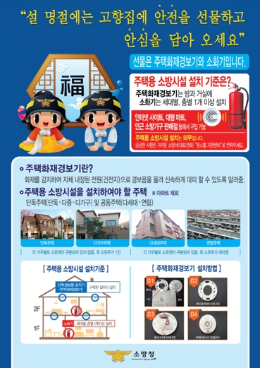 박유진 소방서장은 “자신과 가족의 안전을 지키는 주택용 소방시설 설치에 적극적으로 참여해 주시길 당부 드린다”며 “이번 설 명절에는 고향에 계시는 부모님께 안전을 선물해 뜻깊은 연휴를 보내시기 바란다”고 말했다.