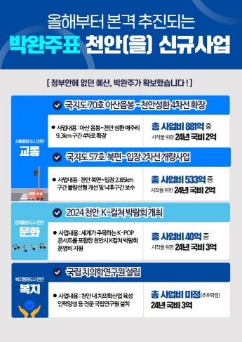 박완주 의원은 지난해 ‘24년 국가 예산 정부안 발표 당시 포함되지 못했던 사업에 대해 국회 심의 당시 사업별 상임위 예산소위원회 심사 과정부터 꼼꼼히 챙기며 국비 확보에 심혈을 기울였다. 그 결과 교통 인프라부터 지역 경제 활성화, 문화예술 발전 등 천안 발전에 꼭 필요한 주요 사업 국비를 추가 확보할 수 있었다.