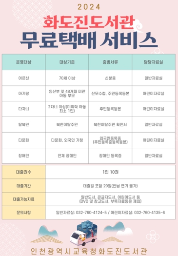 서비스 대상은 70세 이상 어르신, 임산부, 48개월 미만 아동이 있는 보호자, 2자녀 이상의 다자녀, 탈북민과 다문화가정, 장애인 등이다. 무료택배서비스 이용을 위해서는 신분증과 관련 증빙서류를 지참해 화도진도서관에 방문, 회원가입을 신청하면 된다. 자료 신청은 도서관 홈페이지에서도 할 수 있고 학생과 학부모의 도서 선택에 도움을 주고자 매달 추천도서를 선별해 홈페이지 북큐레이션에 탑재한다.