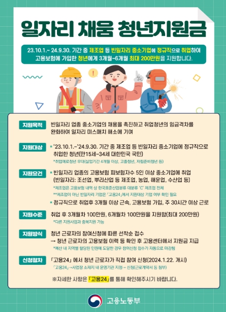 지원 대상은 만15~34세 청년 중 ①제조업 중소기업(고용보험 피보험자 수 5인 이상 우선지원대상기업)에 ②’23.10.1. 이후 정규직으로 취업(주 30시간 이상)하여 ③3개월 이상 근속한 근로자이다. 해당 청년은 누리집 「고용24」에 지원금을 신청할 수 있으며, 3개월·6개월 차에 각 100만 원씩 총 200만 원을 직접 계좌로 지급받는다.