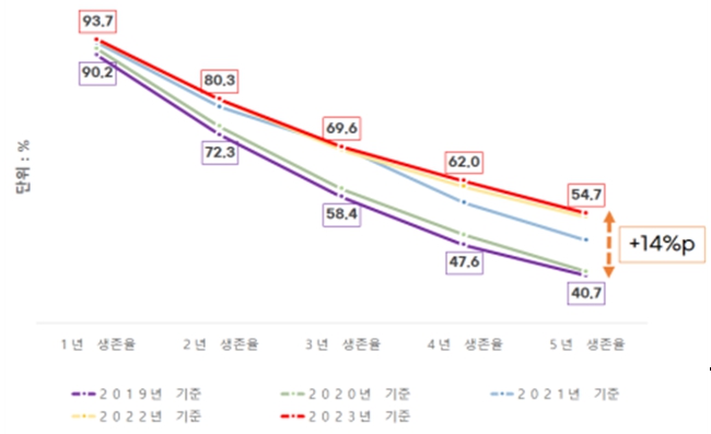 실제로 5년 전과 지난해를 비교했을 때 1년 차 3.5%, 2년 차 8%, 3년 차 11.2%, 4년 차 14.4%, 5년 차 14%로 생존율이 개선된 것으로 나타났다.
