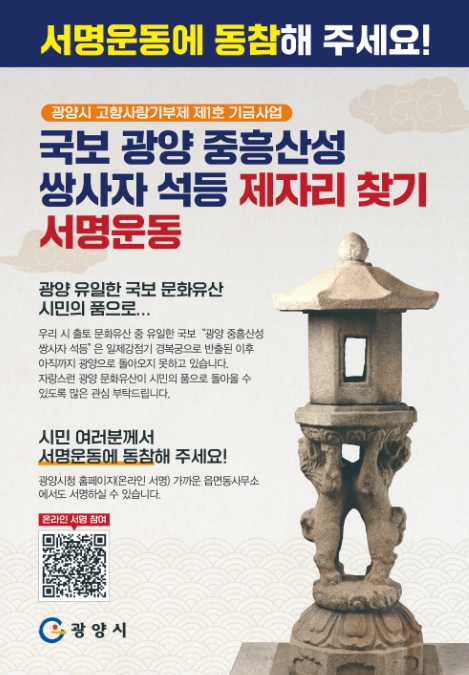 정인화 광양시장은 “우리 시 자랑스러운 문화유산이 시민의 품으로 돌아올 수 있도록 시민들의 많은 관심과 함께 서명운동에 동참해 주시길 바란다”며 “광양을 떠난 쌍사자 석등이 하루빨리 제자리를 찾을 수 있도록 범시민 운동으로 확산되길 기대한다”고 말했다.