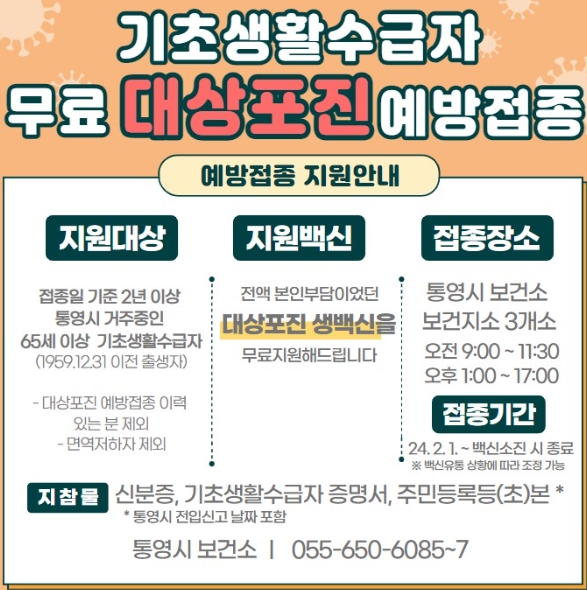 ![]() 통영시, 65세 이상 기초생활수급자 무료 대상포진 예방접종 실시 |