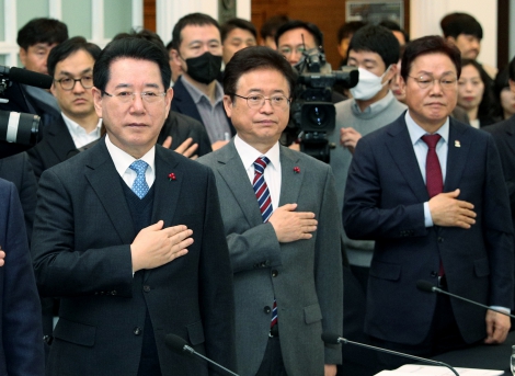 ![]() 김영록 전라남도지사(왼쪽)가 22일 서울 한국프레스센터에서 열린 ‘제58차 대한민국시도지사협의회 임시총회’에서 국기에 대한 경례를 하고 있다. |