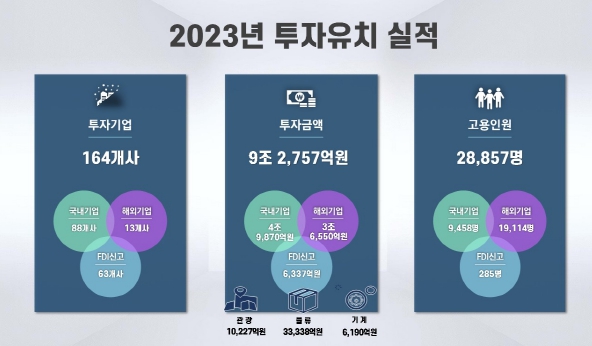 경남도는 지난해 투자유치 9조 2,757억 원을 기록해 전년 대비 43.4% 증가한 역대 최대 투자액을 달성했다. 민선8기 출범 이후 실적은 12조 8,285억 원으로 어려운 경제 상황에서 지역 경제를 빠르게 회복시킨 원동력이 됐다.