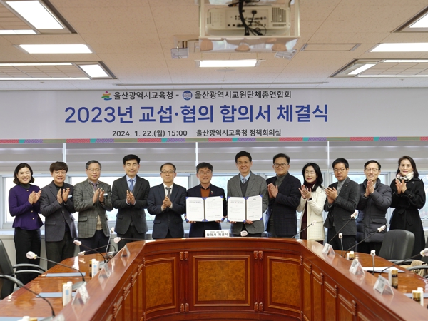 22일에는 정책회의실에서 천창수 교육감과 신원태 울산교총 회장 등이 참석한 가운데 ‘2023년 교섭·협의 합의서 체결식’을 열었다.