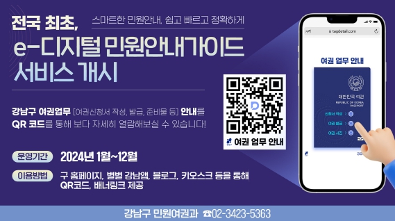 조성명 강남구청장은 “디지털 기술의 도입으로 누구나 여권 업무를 쉽게 이해할 수 있고, 24시간 비대면 안내 서비스를 받을 수 있을 것으로 기대된다”며 “앞으로도 행정 혁신을 이끌어낼 수 있는 디지털 기술을 적극적으로 발굴·적용해, 구민의 편의를 증진하고 만족도를 높이는 행정서비스를 제공하겠다”고 밝혔다.