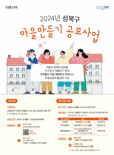 '2024년 성북구 마을만들기 공모사업'은 안전, 소통, 복지, 문화, 환경 등 다양한 영역의 마을 문제를 인식하고, 주민이 제안한 해결 방안을 지원하는 마을공동체 활성화 사업이다.
