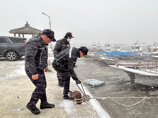 이에 이 서장은 직접 관내 전 해상 풍랑주의보 및 눈보라가 치는 상황에서 어란진·구성항 및 도선 선착장을 방문, 정박어선 고박상태 및 이용객들의 미끄럼 예방을 위한 안전시설물․선착장에 대한 집중점검을 실시했다.