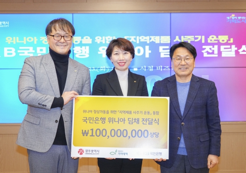 ![]() 강기정 광주광역시장이 23일 오후 시청 비즈니스룸에서 노현주 국민은행 호남지역그룹대표로부터 위니아 딤채를 전달받고 있다. 왼쪽부터 함현석 기아대책 기업후원1본부장, 노현주 대표, 강기정 광주시장. |