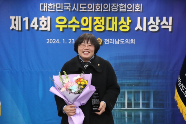 장 의원은 “도의원으로서 도민의 입장에서 도민의 편이 되어 의정활동을 하는 것은 마땅히 해야 할 일을 한 것”이라며 “오늘의 상은 정말 영광스러운 상이며, 지방자치 발전과 도민의 삶의 질을 높이기 위해 끝까지 최선을 다할 수 있도록 항상 소통하며 노력하겠다”고 밝혔다.