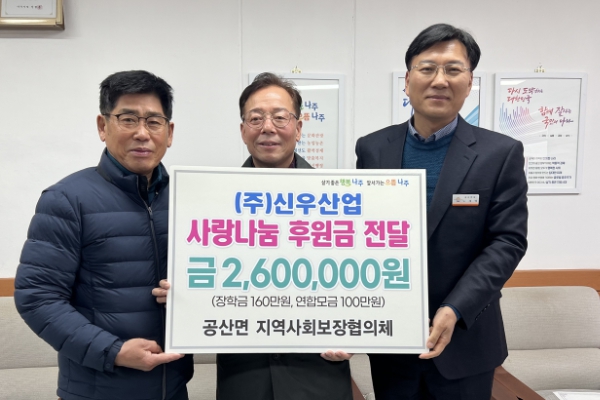![]() ㈜신우산업(대표 하태형, 사진 가운데)이 지역 사랑 실천을 위해 나주시 공산면 지역사회보장협의체에 성금 260만원을 기탁했다. |